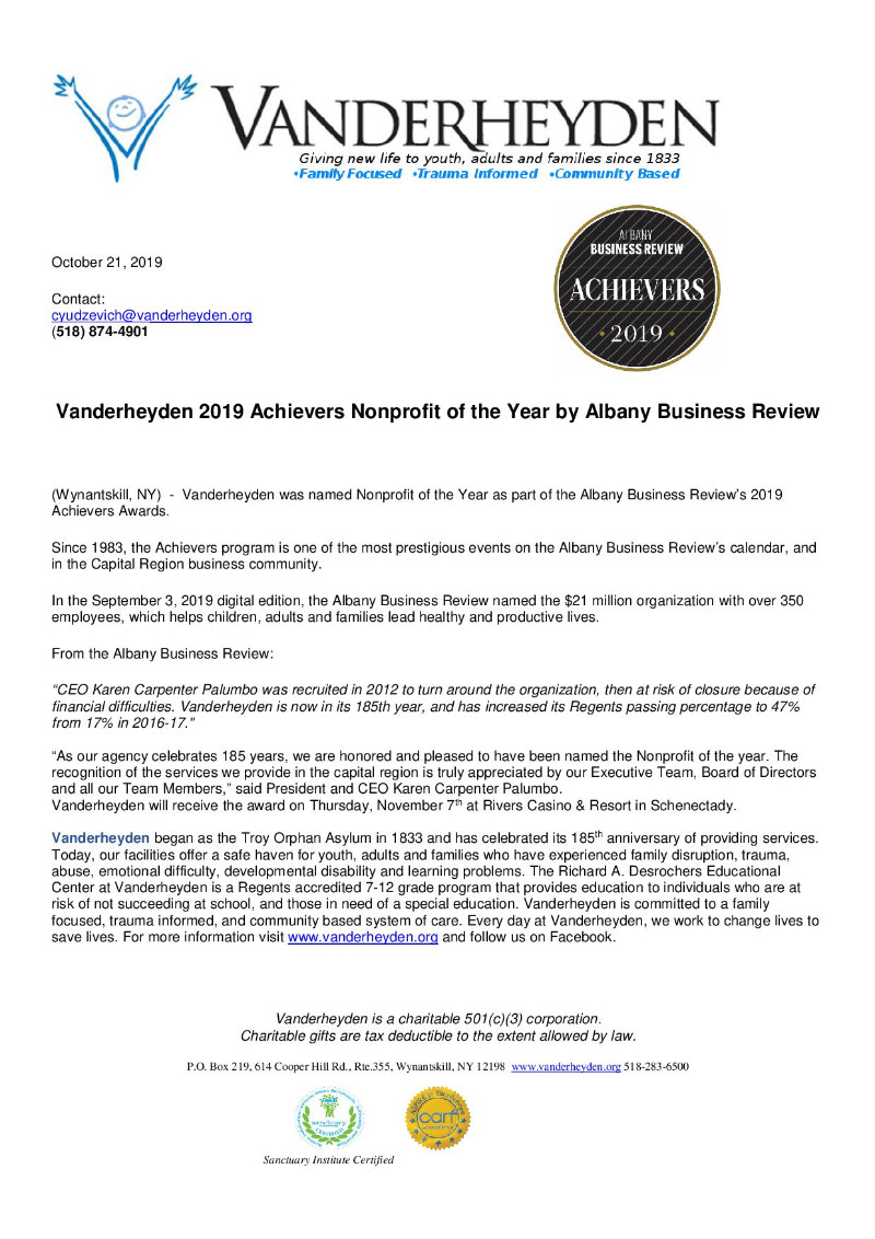Vanderheyden 2019 Achievers Nonprofit of the Year by Albany Business Review SHARE ON: Facebook Twitter Email Other